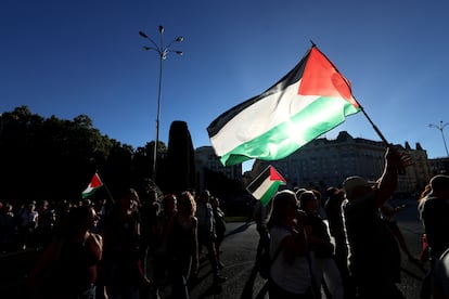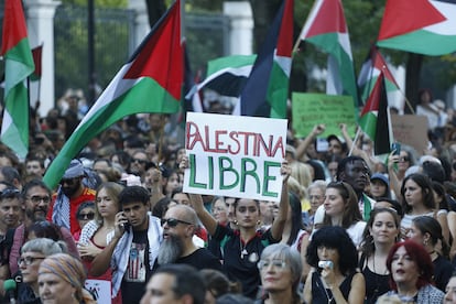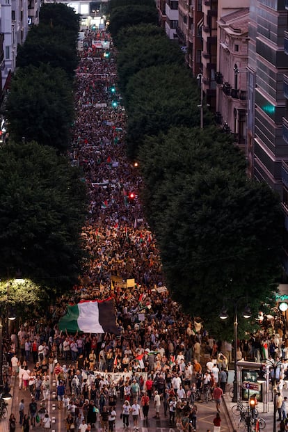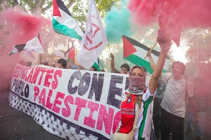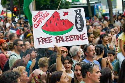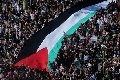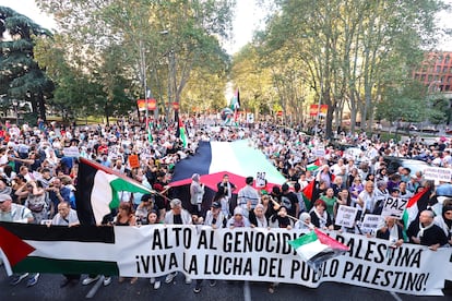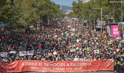 Manuel Bruque (EFE)Una gran bandera de Palestina es portada por los manifestantes en Barcelona. Enric Fontcuberta (EFE)Manifestantes gritan eslóganes contra el genocidio en Gaza, este sábado en Barcelona.Emilio Morenatti (AP)Uno de los carteles de la manifestación en Barcelona.Gianluca BattistaCabecera de la manifestación en Madrid a favor del pueblo palestino, este sábado.Jaime VillanuevaUna joven, con la cara pintada y un pañuelo palestino, participa en la protesta celebrada en Barcelona.Gianluca Battista Una marcha multitudinaria recorre las calles del centro de Pamplona.Jesús Diges (EFE)Cartel contra el genocidio en Gaza durante la marcha en Barcelona, este sábado.Gianluca BattistaUna joven sujeta una bandera palestina durante la marcha en apoyo a Gaza celebrada en Madrid.Jaime VillanuevaUna manifestante sujeta un cartel contra el genocidio de Gaza, este sábado en Barcelona.Gianluca BattistaVista de la cabecera de la manifestación de Barcelona.Gianluca BattistaUn participante en la marcha de Madrid ondea una bandera de Palestina, este sábado.Jaime VillanuevaManifestación en Málaga por Palestina en el marco de la movilización estatal convocada por la RESCOP bajo el lema 'Paremos el genocidio en Palestina, comercio de armas y de relaciones con Israel, por un embargo integral'. Álvaro Cabrera (EFE)Una mujer sostiene un cartel a favor de Palestino y contra la complicidad de Europa, este sábado en Madrid.Andrea ComasManifestantes gritan eslóganes durante la manifestación en apoyo a Gaza en Madrid. Andrea Comas