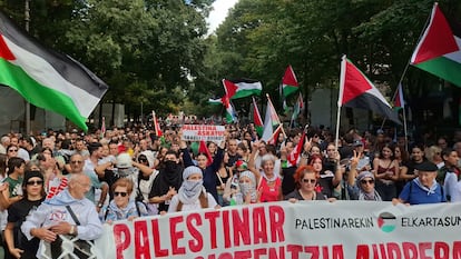 Llegados desde distintos puntos del País Vasco y Navarra, miles de manifestantes —50.000 según los organizadores y 10.000 según la Delegación del Gobierno— recorrieron Pamplona para denunciar el “genocidio” y expresar solidaridad con el pueblo palestino. “Gaza, aguanta, el mundo se levanta”, “Boikot Israel” o “Gora palestinar erresistentzia (viva la resistencia palestina)” fueron algunas de las consignas de una marcha multitudinaria.