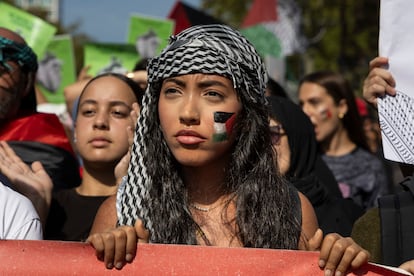 En Madrid, una multitud se unió a la manifestación, que salió desde la estación de Atocha a las 18.00 horas. “Hagamos ruido y que se enteren de que de verdad nos parece una injusticia lo que está pasando en Gaza”, afirma Celia Balandín, uno de los muchos rostros jóvenes en la protesta, que según las entidades convocantes logró la respuesta de 500.000 personas, cifra que la Delegación del Gobierno rebajó a algo menos de 100.000. “Que dejen de masacrar, permitan entrar el alimento y se reconozca al Estado palestino”, reivindica Aixa Bulaizh, de 71 años. A su lado, Paloma Fernández, de 67, se muestra contenta al ver a tanta gente joven. Cuenta que participa en los actos en solidaridad con Gaza desde hace dos años y que esta marcha, “sin duda, es la más multitudinaria”.