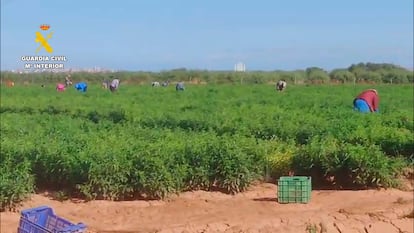 Más de una decena de trabajadores del campo que faenaba con total tranquilidad comenzó a correr por una plantación en La Rioja al advertir la presencia de una patrulla de la Guardia Civil. Fruto de la estampida, las cajas de las verduras quedaron diseminadas por la parcela. Otros jornaleros, más tranquilos, observaban la escena. Los agentes participaban en una investigación en la que han sido detenidas siete personas por explotar a 45 trabajadores inmigrantes con la promesa irreal de legalizar su situación administrativa en España. Entre sus víctimas, que dormían en colchones en el suelo de habitaciones sin ventilación, había tres menores, de 12, 15 y 17 años. Los jóvenes estaban sometidos a las mismas condiciones que el resto de los adultos, según ha informado el cuerpo policial este miércoles. “Trabajaban de sol a sol”, señalan fuentes conocedoras de la operación.