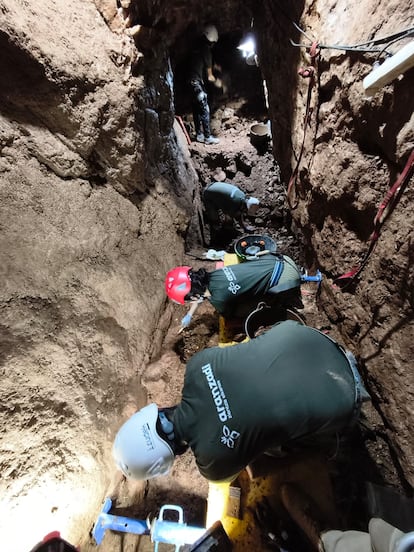 En este paraje, una antigua mina de wolframio que funcionó en el siglo XIX, el equipo de Aranzadi busca a entre 22 y 24 personas. “Eran en su mayoría jornaleros de edades comprendidas entre los 20 y 40 años que fueron asesinados por ser militantes o simpatizantes de partidos u organizaciones de izquierdas. Creemos que entre las víctimas hay una mujer, maestra”, relata Chaves. Los trabajos, en los que participan una decena de especialistas, han sido muy complejos. “Los restos”, explica la antropóloga Lourdes Herrasti, “estaban a 36 metros de profundidad [el equivalente a un edificio de 12 plantas]. Llegar hasta aquí ha sido una tarea titánica porque tuvimos que sacar 30 toneladas de piedras, basura, neumáticos...”. La mina abandonada se encuentra en un lugar apartado y durante la guerra era utilizado por falangistas para hacer desaparecer los cadáveres de sus víctimas. El equipo ha colocado una cámara en la zona donde trabajan y una pantalla en la boca de la mina para que los familiares de los represaliados puedan seguir sus trabajos. “Cuando aparecieron los primeros restos”, relata Luciano Montero, “la gente se puso a llamar a todos sus familiares, llorando...”. El abuelo de Luciano —él se llama así por él—, tenía 29 años cuando lo mataron, un hijo de tres años y una hija de 40 días. “Era jornalero”, explica su nieto, “y nos enteramos de que podía estar aquí gracias al trabajo de Julián Chaves, que se dedicó durante años a recorrer los pueblos de la zona, recoger testimonios y documentos. En mi casa, ni mi padre ni mi abuela hablaron nunca de lo que había pasado. Tenían mucho miedo, les tocó convivir con los asesinos... A través de lo que comentaban otros, supo que a su padre lo habían matado en 1936″.