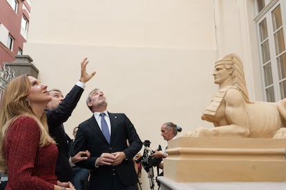 Pocos edificios resultan tan llamativos en las islas. Ubicado en una discreta calle peatonal de Santa Cruz de Tenerife, su fachada ofrece imponentes columnas palmiformes que sostienen al ojo “que todo lo ve”. Y vigilando las escalinatas de entrada, cuatro esfinges —durante años todas sin nariz, como la de Giza—. Desde la apertura del Templo Masónico en 1904 hasta la Guerra Civil, sus salas albergaron las discusiones de una de las logias masónicas que proliferaron en las islas, y fue lugar de encuentro y reflexión. Y pese a ello, el inmueble ha sufrido durante las últimas décadas un importante abandono que lo dejó prácticamente en ruinas. Hasta este lunes. El alcalde de la ciudad, José Manuel Bermúdez; acompañado por el presidente de Canarias, Fernando Clavijo, además del ministro de Política Territorial y Memoria Democrática, Ángel Víctor Torres, y la presidenta del Cabildo tinerfeño, Rosa Dávila, han presidido la reapertura del palacete tras una “minuciosa” rehabilitación —según las propias palabras del alcalde—, emprendida en el año 2022 que ha costado algo más de tres millones de euros aportados por el Ministerio de Cultura.