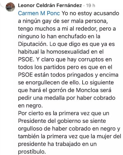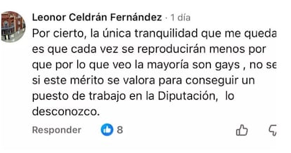 “La única tranquilidad que me queda es que cada vez se reproducirán menos, por lo que veo la mayoría son gays. No sé si este mérito se valora para conseguir un puesto de trabajo en la Diputación”, decía la asesora en una de sus respuestas a publicaciones de Facebook. Otros usuarios le recriminaban sus mensajes, a lo que Celdrán les contestaba: “Ya es habitual la homosexualidad en el PSOE. Claro que hay corruptos en todos los partidos, pero en el PSOE están todos pringados y encima se enorgullecen de ello”.