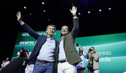 El presidente de Andalucía, Juanma Moreno, en el congreso del partido en Sevilla. / PACO PUENTES