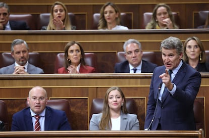 El líder de Vox, Santiago Abascal, dibujó un Gobierno “inundado de corrupción” y pendiente de que Sánchez “evite la cárcel”, pero resultó más enigmático cuando aconsejó a Feijóo que no empiece ya a repartir ministerios para que no le suceda lo que ocurrió en las elecciones de julio de 2023. Para Abascal, que está justo ahora negociando con el PP nacional el futuro del gobierno valenciano tras la caída final de Carlos Mazón, los populares son lo mismo que el PSOE, están juntos en Bruselas y en Ceuta, pactan aumentar los diputados en Castilla-La Mancha y se reparten el Consejo General del Poder Judicial.