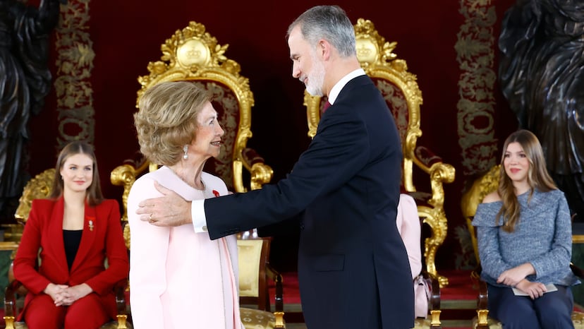 Poco antes de las 10.30, entraban los Reyes en coche por la plaza de la Armería al Palacio Real seguidos de la princesa Leonor y la infanta Sofía. En el interior les esperaban ya los dos padres de la Constitución, el expresidente del Gobierno y la reina emérita, para la que Felipe VI ha tenido palabras de cariño al cierre del acto: “[Ha tenido] una vida entera de servicio ejemplar y de lealtad a España y a la Corona, apoyando con convicción al rey Juan Carlos en su acertada y temprana apuesta por la apertura democrática y las libertades. Gracias por tu compromiso sostenido durante décadas ―todavía hoy― y ejercido con un profundo sentido del deber", ha remarcado Felipe VI. “Se ha ganado para siempre el respeto y afecto del pueblo español”, ha añadido Felipe González.
