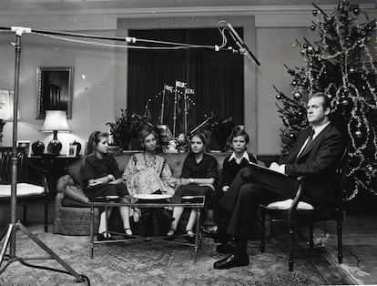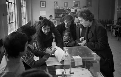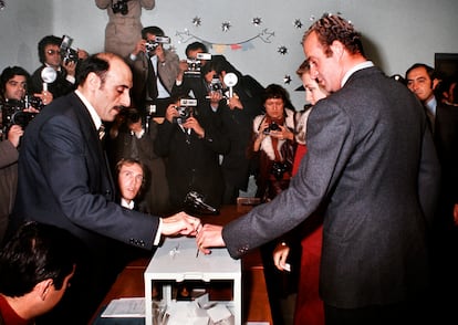 EFEGrabación del mensaje de Navidad de 1977, en la Zarzuela. Desde la izquierda, la infanta Elena, la reina Sofía, la infanta Cristina y el príncipe Felipe, en una imagen de la Casa Real. “La paz y la libertad son el compromiso insobornable de la Monarquía”.Una mujer se dispone a votar en una mesa de un colegio electoral en Madrid, en el referéndum sobre la Constitución, el 6 de diciembre de 1978.Chema ConesaEl rey Juan Carlos es aplaudido por las Cortes, en el acto de la ratificación de la Constitución por el Rey, el 27 de diciembre de 1978.Marisa FlórezLos reyes Juan Carlos y Hassan II saludan desde un descapotable, en las calles de Fez, en el primer viaje oficial del monarca español a Marruecos el 14 de junio de 1979.