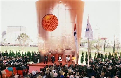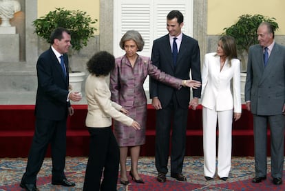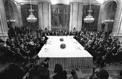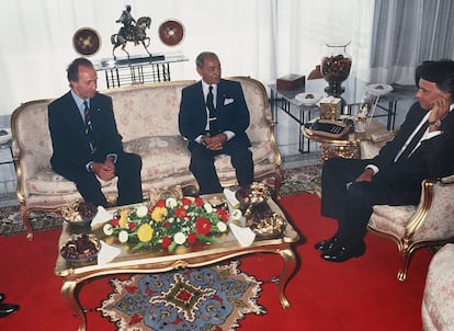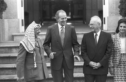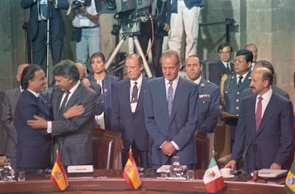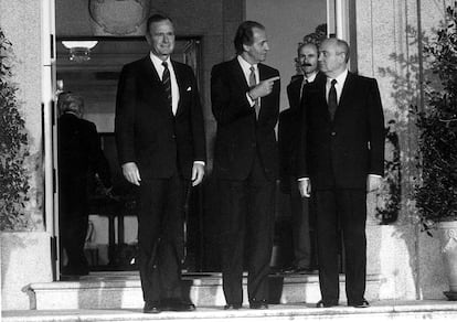 Desde la izquierda, los reyes Juan Carlos y Hassan II, y el presidente del Gobierno, en Rabat (Marruecos), el 4 de julio de 1991. Firma del tratado de amistad y cooperación con Marruecos.DANIEL BELTRÁ (EFE)El rey Juan Carlos, junto al presidente de Estados Unidos, George Bush, a la izquierda, y el líder soviético, Mijaíl Gorbachov, en el palacio de la Zarzuela en Madrid, con motivo de la Conferencia de Paz sobre Oriente Próximo de Madrid, el 29 de octubre de 1991. Marisa FlórezLa Sala de Columnas del Palacio Real, en Madrid, durante la inauguración de la Conferencia de paz de Madrid sobre Oriente Próximo, el 30 de octubre de 1991. Luis MagánDesde la izquierda, el presidente de Argentina, Carlos Menem, saluda al presidente del Gobierno español, Felipe González, en presencia del rey Juan Carlos I de España y del presidente del país anfitrión, Carlos Salinas de Gortari, durante la sesión de apertura de la primera Cumbre Iberoamericana de Jefes de Estado y de Gobierno de Guadalajara (México), el 18 de julio de 1991.
