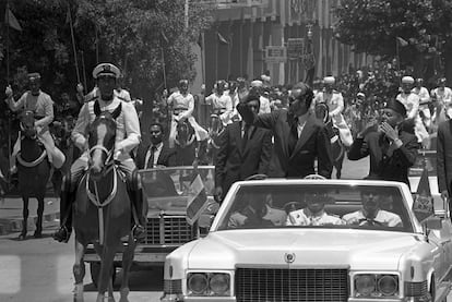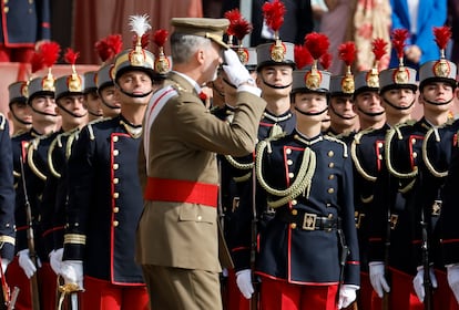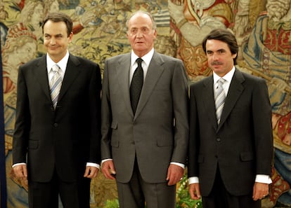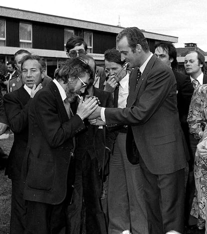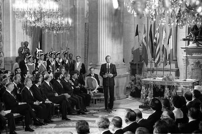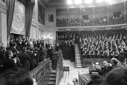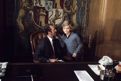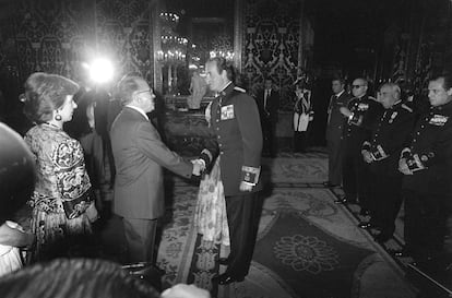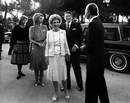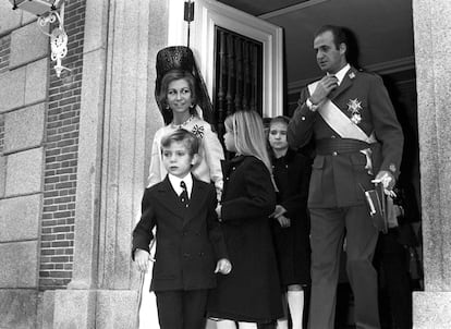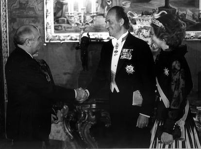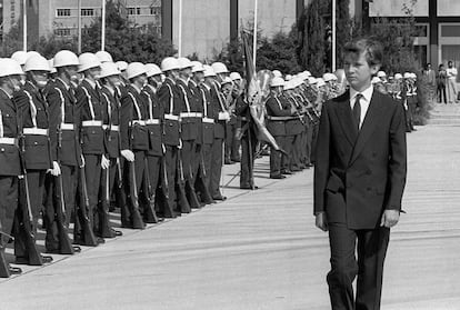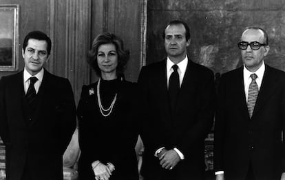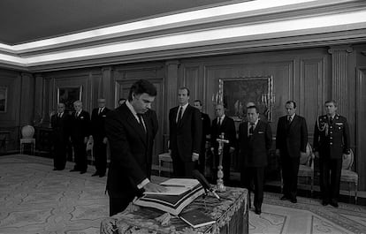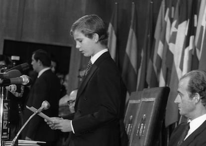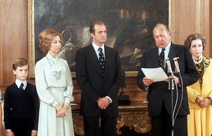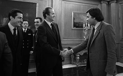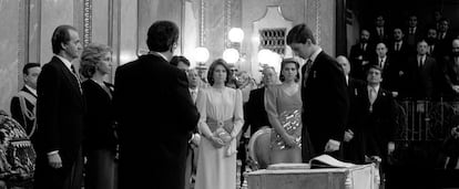 EFEEl rey Juan Carlos saluda al dirigente comunista Santiago Carrillo, durante la recepción ofrecida en el Palacio Real con motivo de la onomástica del Rey el 24 de junio de 1980.Marisa FlórezMensaje del rey Juan Carlos, del 23-F. En él, que ordena el mantenimiento del orden constitucional tras el asalto del teniente coronel Tejero al Congreso de los Diputados durante la sesión de investidura de Leopoldo Calvo Sotelo el 23 de febrero de 1981. “La corona no puede tolerar acciones o actitudes de personas que pretendan interrumpir por la fuerza el proceso democrático”. TVE (EFE)El rey Juan Carlos saluda a Felipe González, en presencia del presidente del Gobierno, Adolfo Suárez, a la izquierda, y de Agustín Rodríguez Sahagún, detrás, en la recepción en el palacio de la Zarzuela a los líderes políticos tras el intento de golpe de Estado del 23-F, el 24 de febrero de 1981. Marisa FlórezDesde la izquierda, el expresidente Adolfo Suárez, los reyes Sofía y Juan Carlos I y Leopoldo Calvo-Sotelo, en la toma de posesión del último como presidente del Gobierno, en el palacio de la Zarzuela, el 26 de febrero de 1981.Marisa FlórezEl 3 de octubre de 1981 don Felipe, de 13 años, pronuncia en Oviedo su primer discurso público con motivo de la entrega de la primera edición de los premios Príncipes de Asturias. Don Juan Carlos, consciente de la importancia de la primera intervención pública del heredero a la Corona, protagoniza una de las anécdotas de la jornada al preguntar con insistencia durante su propio discurso sobre el estado de ánimo del Príncipe y asegurarse de que leerá el suyo.EFE“Toma, Santiago, que siempre me quemas las alfombras”, le dijo el rey Juan Carlos a Carrillo mientras le acerca un cenicero, en la recepción a los líderes de los partidos parlamentarios en Zarzuela, en la jornada de reflexión de las elecciones legislativas. En sentido contrario al de las agujas del reloj, desde la izquierda: Xabier Arzalluz, Manuel Fraga, Landelino Lavilla, Adolfo Suárez, Felipe González, Santiago Carrillo, Miquel Roca y Leopoldo Calvo-Sotelo. Ese día, el 27 de octubre, era el señalado para una intentona golpista, que fue desbaratada a principios de octubre. Su plan incluía acabar violentamente con los líderes de la oposición y bombardear con artillería la Zarzuela, Moncloa y la sede la Junta de Jefes de Estado Mayor, culpando a ETA y al Gobierno por su ineficaz lucha contra el terrorismo, lo que justificaría una intervención militar. La intentona pasó desapercibida para la opinión pública y apenas afectó a la campaña electoral.Marisa FlórezToma de posesión de Felipe González como presidente del Gobierno, en un acto presidido por el rey Juan Carlos en la Zarzuela, el 2 de diciembre de 1982, en la que utilizó la fórmula de "prometo". González se convertía en el quinto presidente del Gobierno de la monarquía, después de Carlos Arias Navarro, Fernando de Santiago (interino durante solo unos días), Adolfo Suárez y Leopoldo Calvo-Sotelo. Marisa FlórezFelipe de Borbón pasa revista, el 31 de mayo de 1983, a las tropas de la XI Escuadrilla Aérea que rinden honores en el aeropuerto de Barajas, en su viaje a Latinoamérica, con motivo del 450º aniversario de la fundación de Cartagena de Indias (Colombia). Tiene 15 años y ostentará por primera vez la representación oficial de la Jefatura del Estado.Llegada del presidente de Estados Unidos, Donald Reagan, y la primera dama, Nancy, al palacio de la Zarzuela, recibidos por los Reyes en su viaje oficial a España. La infanta Cristina, al fondo, el 6 de mayo de 1985. Marisa FlórezDiscurso de Juan Carlos I en la firma de ingreso de España y Portugal en la Comunidad Económica Europea (precedente de la Unión Europea), el 12 de junio de 1985, en el Palacio Real. La entrada sería efectiva el 1 de enero de 1986. Alfredo García FrancésEl príncipe Felipe jura la Constitución ante el presidente del Congreso de los Diputados, Gregorio Peces Barba (de espaldas), en un acto conjunto de las Cortes, en presencia de los reyes, Juan Carlos y Sofía, y sus hermanas las infantas, Cristina y Elena, al alcanzar la mayoría de edad, el 30 de enero de 1986.Marisa FlórezPrimer día de clase del Príncipe de Asturias como universitario, junto a sus compañeros, en un aula de la Facultad de Derecho de la Universidad Autónoma de Madrid, el 18 de octubre de 1989. Complementaría estos estudios con clases en la de Economía. El futuro Felipe VI será el primer soberano español con una licenciatura.Ricardo GutiérrezEl rey Juan Carlos y Mijail Gorbachov se estrechan la mano, en presencia de la reina Sofía y Raisa Gorbachova, en la cena de gala en honor del líder soviético en el palacio Real en Madrid, el 26 de octubre de 1990.Marisa Flórez