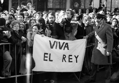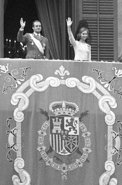 EFEUna pancarta de “Viva el Rey”, en la plaza de Oriente de Madrid, durante la proclamación del monarca, el 27 de noviembre de 1975. Gianni Ferrari (Getty Images)Los reyes Juan Carlos y Sofía saludan desde el balcón del Palacio Real al público congregado en la plaza de Oriente, tras su proclamación del monarca, el 27 de noviembre de 1975.