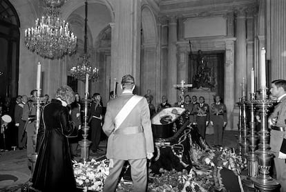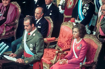 El 20 de noviembre de 1975, Francisco Franco muere a los 82 años tras casi 40 años de dictadura. El 22 de noviembre Juan Carlos I es proclamado rey por las Cortes. La monarquía vuelve a España desde el exilio de su abuelo Alfonso XIII en 1931, en un país que desde la Ley de Sucesión de 1947 se denominaba oficialmente Reino de España.GETTY IMAGESEl rey Juan Carlos lee su discurso en las Cortes generales el día de su proclamación el 22 de noviembre de 1975. Pero todas las miradas son para la reina Sofía. Muy críticada por su vestido fucsia (diseño de las hermanas Molinero), en un país de luto, con un "caudillo" todavía de cuerpo presente. Una declaración de intenciones de los cambios que vendrían.Europa PressLos reyes Juan Carlos y Sofía visitan la capilla ardiente de Francisco Franco, en el Palacio Real, en Madrid, tras la ceremonia del juramento y la proclamación en el Palacio de las Cortes, el 22 de noviembre de 1975.EFELos reyes Juan Carlos y Sofía, acompañados por sus hijos, Felipe, Elena y Cristina, salen de la Zarzuela para trasladarse a la iglesia de los Jerónimos, donde tendrá lugar la misa del Espíritu Santo con motivo de su proclamación, el 27 de noviembre de 1975.