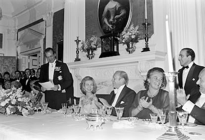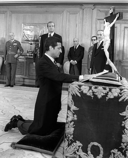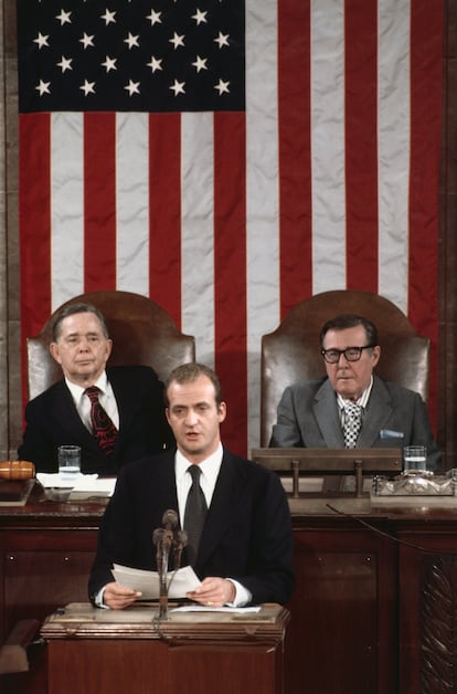 EFEAdolfo Suárez jura su cargo de presidente del Gobierno, en un acto presidido por el rey Juan Carlos en el palacio de la Zarzuela, en Madrid, el 5 de julio de 1976. En la imagen, Fernando de Santiago (a la izquierda), quien fuera presidente interino durante unos días hasta la toma de posesión de Suárez, Torcuato Fernández Miranda (a la derecha), presidente de las Cortes, y Nicolás Cotoner y Cotoner, jefe de la Casa del Rey, al fondo. EFEEl rey Juan Carlos, en la cena de gala de la embajada de España en Washington, el 3 de junio de 1976. Junto a la reina Sofía, el presidente Gerard Ford, y Happy Rockefeller, esposa del vicepresidente Nelson Rockefeller. WWD (Penske Media via Getty Images)El rey Juan Carlos lee su histórico discurso ante congresistas y senadores, en una sesión conjunta en el Capitolio de Estados Unidos, el 2 de junio de 1976. Es la primera vez que Juan Carlos habla de democracia: “La Monarquía hará que, bajo los principios de la democracia, se mantengan en España la paz social y la estabilidad política, a la vez que se asegure el acceso ordenado al poder de las distintas, alternativas de gobierno, según los deseos del pueblo libremente expresados. La Monarquía simboliza y mantiene la unidad de nuestra nación, resultando libre la voluntad decidida de incontables generaciones de españoles, a la vez que coronamiento de una rica variedad de regiones y pueblos, de la que nos sentimos orgullosos”. Bettmann (Bettmann Archive)El rey Juan Carlos I, acompañado del príncipe Felipe, recibe a la prensa en su despacho de la Zarzuela, el 12 de noviembre de 1976, con motivo de su primer aniversario en el trono.VOLKHART MÜLLER (EFE)Los Reyes votan en el colegio electoral de El Pardo, en Madrid, en el referéndum sobre la Ley para Reforma Política, el 15 de diciembre de 1976. Conocida como el ‘harakiri’ de las Cortes franquistas, es la ley que permite el desmontaje de las estructuras creadas por el franquismo y la celebración de las elecciones generales de 1977. OLEGARIO PEREZ DE CASTRO (EFE)El papa Pablo VI recibe a los reyes en el Vaticano el 10 de febrero de 1977. La reina Sofía, con mantilla blanca, prerrogativa de las monarcas católicas.Bettmann (Getty Images)El rey Juan Carlos enciende el cigarrillo de uno de los trabajadores españoles que se acercaron a saludarle, en su visita a la fábrica de coches Mercedes, en Sindelfingen (Alemania), el 22 de abril de 1977. EFE“Majestad, por España, todo por España. ¡Viva España! ¡Viva el Rey!”, proclama don Juan de Borbón en el acto de renuncia de sus derechos dinásticos a favor de su hijo el 14 de mayo de 1977 en el palacio de la Zarzuela. El conde de Barcelona cedía a su hijo, que llevaba ya año y medio en el trono, la jefatura de la familia y la Casa Real.