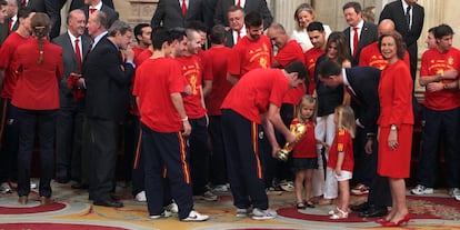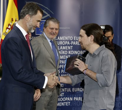 76,6% de cuota de pantalla y 12.443.000 espectadores. El líder de Podemos y eurodiputado, Pablo Iglesias, saluda al rey Felipe VI y le entrega la serie de 'Juego de Tronos' durante la visita del monarca a la Eurocámara en Bruselas el 15 de abril de 2015. Sergio Barrenechea (EFE)Cristina de Borbón, hermana del rey Felipe VI y sexta en la línea de sucesión a la Corona, se convierte el 3 de marzo de 2016 en el primer miembro de la realeza española en declarar ante un tribunal, acusada de dos delitos fiscales. La exduquesa de Palma se desvinculó de la gestión de la mercantil Aizoon, que compartía al 50% con su esposo, Iñaki Urdangarin, y que supuestamente sirvió para desviar 923.049 euros de contratos públicos del Instituto Nóos y para evadir 337.000 euros a Hacienda en 2007 y 2008. “No tenía firma ni poderes en Aizoon (...) nunca di instrucciones a nadie en la sociedad”, afirmó. “Confío plenamente en mi marido y estoy convencida de su inocencia”.El rey Felipe VI, en la manifestación tras los atentados yihadistas en Cataluña, el 26 de agosto de 2017. Desde la izquierda, en primera fila, Pío García Escudero, presidente del Senado; Ana Pastor, presidenta del Congreso; Mariano Rajoy, presidente del Gobierno; Felipe VI, Carlos Puigdemont, presidente de la Generalitat de Cataluña, y Ana Colau, alcaldesa de Barcelona. Detrás, Fátima Báñez, minsitra de Empleo; Dolors Montserrat, de Sanidad; Juan Ignacio Zoido, Interior; Dolores de Cospedal, Defensa; Cristina Cifuentes, presidenta de la Comunidad de Madrid; Alberto Núñez Feijóo, de Galicia, Miguel Ángel Revilla, de Cantabria; Ximo Puig, de la Comunidad Valenciana, entre otras autoridades en la manifestación con el lema "No tinc por (No tengo miedo)". Los atentados del 17-A causaron la muerte de 16 personas, entre ellas dos niños, y 350 heridosMassimiliano MinocriUna persona con una estelada sigue el discurso de Felipe VI el 3 de octubre de 2017. En una alocución excepcional