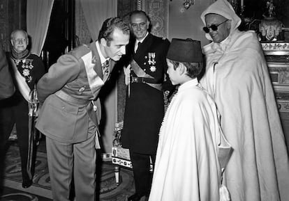 EFEEl rey Juan Carlos habla con Mohamed, príncipe heredero de Marruecos, en la recepción en el Palacio Real, a los dignatarios extranjeros que acudieron a los actos de proclamación el 27 de noviembre de 1975.