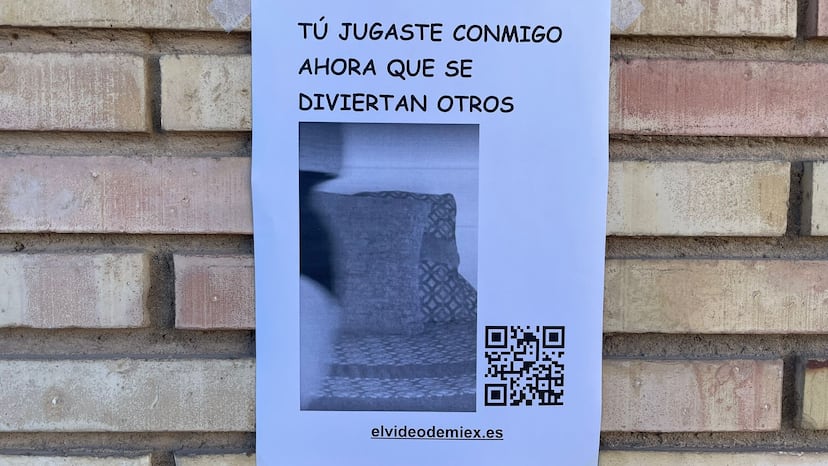 Carteles con el mensaje ‘Tú jugaste conmigo, ahora que se diviertan otros’ y un código QR que remite a la web elvideodemiex.es aparecen colgados por toda la ciudad