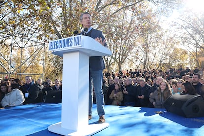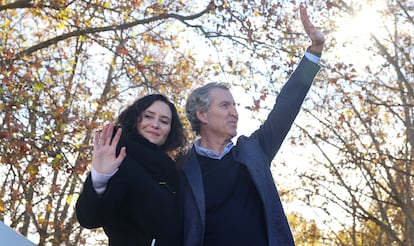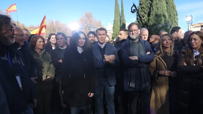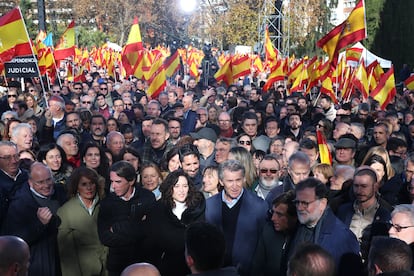 Los dirigentes populares, desde la izquierda, José Luis Martínez-Almeida, Mariano Rajoy, José María Aznar, Alberto Núñez Feijóo, Isabel Díaz Ayuso y Miguel Tellado, al final del acto.Jaime Villanueva La presidenta de la Comunidad de Madrid, Isabel Díaz Ayuso, y el líder del PP, Alberto Núñez Feijóo. Jaime VillanuevaVista general de los participantes en la protesta en el Templo de Debod, este domingo, en Madrid.Jaime VillanuevaLos dirigentes del Partido Popular, desde la izquierda, Miguel Tellado, Ana Botella, José María Aznar, Isabel Díaz Ayuso, Alberto Núñez Feijóo y Mariano Rajoy.Jaime VillanuevaEl presidente del Partido Popular, Alberto Núñez Feijóo, en un momento de su intervención en el Templo de Debod de Madrid.Jaime VillanuevaCartel con la imagen del presidente del Gobierno, Pedro Sánchez, en la protesta en el Templo de Debod de Madrid.Juanjo Martín (EFE)José María Aznar, expresidente del Gobierno y del Partido Popular, a su llegada a la concentración.Juanjo Martín (EFE)La presidenta de la Comunidad de Madrid, Isabel Díaz Ayuso, durante su participación en la concentración.