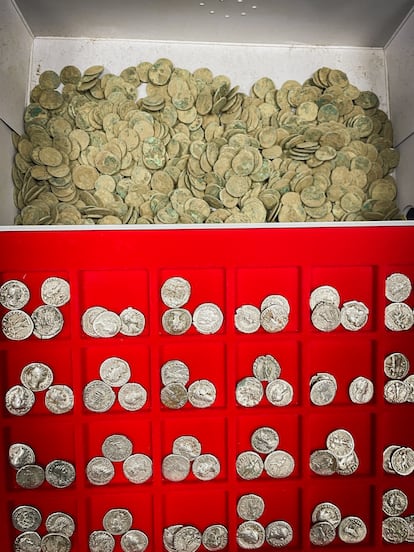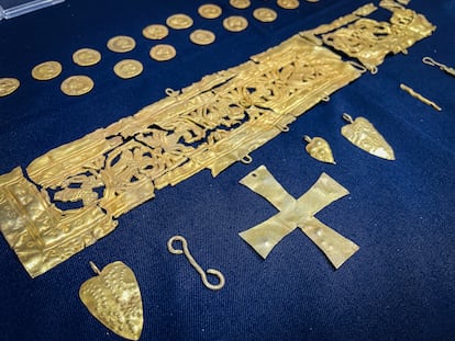 Entre 6.000 monedas de plata, otra veintena de oro y cerca de un millar de objetos arqueológicos, una corona visigoda fragmentada del siglo VI destaca como la pieza más llamativa. Todo el conjunto ha sido recuperado por la Policía Nacional tras la detención de siete personas en la provincia de León, dedicadas al expolio de yacimientos arqueológicos. “No es habitual encontrar un tesoro como este, no se ha visto antes”, ha señalado Miguel Ángel Espada, inspector jefe de grupo de la Brigada de Patrimonio Histórico. Aunque su valor es principalmente histórico, se estima que la venta ilegal de las piezas hubiera superado el millón de euros.