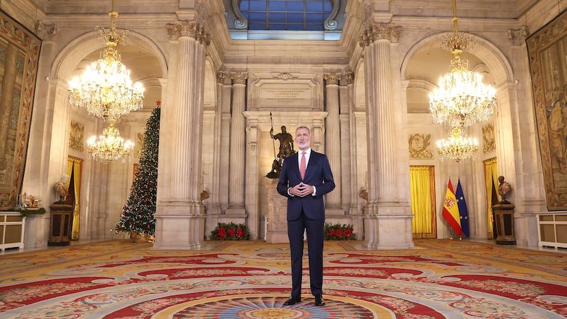 Un Rey en pie, por vez primera, no cómodamente sentado como en anteriores años, ha pronunciado este 24 de diciembre su mensaje de Navidad. Vestido con traje azul marino, camisa blanca y corbata color terracota con estampado geométrico, dispuesto a echarse andar en cualquier momento, a “dar pasos con acuerdos y renuncias, pero en la misma dirección”, como él ha instado a que hagan todos los españoles. Ha sido el discurso más breve que ha pronunciado en las 12 Navidades que lleva en el trono (1.126 palabras), frente al más largo (1.806 palabras), el año pasado, que perdió cuota de pantalla. Un discurso de nueve minutos y dos segundos que puede ser visto sin que la cena de Nochebuena se enfríe y rular por las redes sociales.