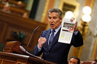 El líder del PP, Alberto Núñez Feijóo, durante su intervención en el Congreso este miércoles. / Claudio Álvarez