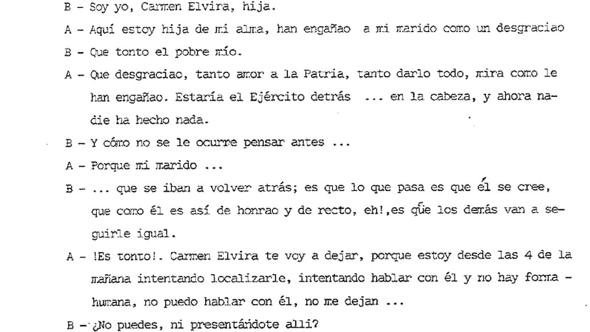 —¡Es tonto! Carmen Elvira, te voy a dejar, porque estoy desde las cuatro de la mañana intentando localizarle, intentando hablar con él y no hya forma humana, no puedo hablar con él, no me dejan... —dice la esposa de Tejero.
