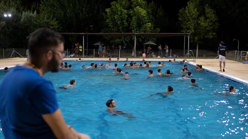 La piscina, de 25 por 12 metros, tiene un aforo máximo de 165 personas. Alejandro, Álvaro, David, Miguel y José Manuel, de entre 18 y 19 años, son un grupo de amigos sin piscina en su domicilio y vienen cada noche: “Somos una pequeña familia, nos gusta el deporte, ahora venimos de jugar a fútbol y aprovechamos esta actividad para bañarnos, jugar a las cartas o para olvidarnos un rato de los móviles”, afirman.