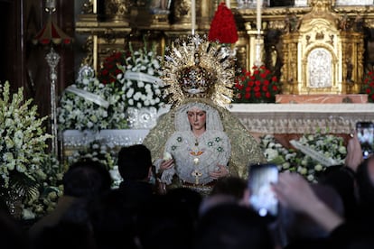 “Es de nuevo ella”, explica José. Son poco más de las 10 de la mañana y acaba de salir de la basílica donde llevaba haciendo cola desde las 5.45 de la mañana. Es vive en el barrio, pero Mari Carmen ha venido desde El Aljarafe sevillano para ver el resultado de la restauración. “Venía conduciendo con miedo, pensando si se habría podido recuperar la expresión original, si íbamos a tener su mirada de siempre... Y sí, es la misma”, cuenta emocionada.