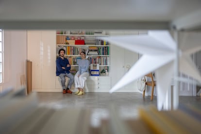 Entre los participantes de esa muestra estará el equipo del estudio de arquitectura POOF POOF, de cierto aire experimental, y formado por el almeriense Julio Sánchez y la sevillana María Amador. Ambos estudiaron en Sevilla y pasaron por Barcelona para hacer un máster. Él trabajo después en la ciudad condal y Berlín. Ella en Londres, Texas y Atenas. Durante el covid se vio construyendo un hospital pandémico y unas torres de viviendas de lujo en Málaga. “Lo dejé porque era como mi antitrabajo”, recuerda. Con el tiempo, ambos volvieron a coincidir en Sevilla y, en 2024, levantaron su estudio. Con su primer proyecto de obra nueva entre manos (una casa en Las Cabezas de San Juan), su horizonte es diverso. Trabajan con mobiliario —lo que les lleva cada año a exponer en el Salone del Mobile del Milán o el Madrid Design Festival— y también se han especializado en escenografías de eventos, sobre todo con flores en sociedad, con un negocio de Lisboa al que reformaron su local.