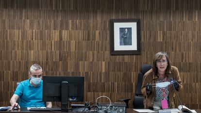La juez conduce por la trastienda del edificio hasta la sala de vistas 118, que según un cartel de la empresa de limpieza, acaba de ser desinfectada. Está reservada, en condiciones normales, a los juicios por delitos leves (las antiguas faltas). Pero ahora se emplea para los interrogatorios: son más amplias y permiten la conexión por videoconferencia, principal vía en la toma de declaraciones. A Carmen no le gusta el sistema. No solo porque la calidad del sonido deja mucho que desear (“a veces parece un diálogo de Gila”), sino porque se ven mermadas las garantías del proceso penal. “Yo así no me siento juez, es una ficción. El detenido no deja de estar en un calabozo, custodiado por policías, y no ante un juez. Además, al ver al acusado, el juez se percata de si tiene miedo, está ansioso… o miente”.