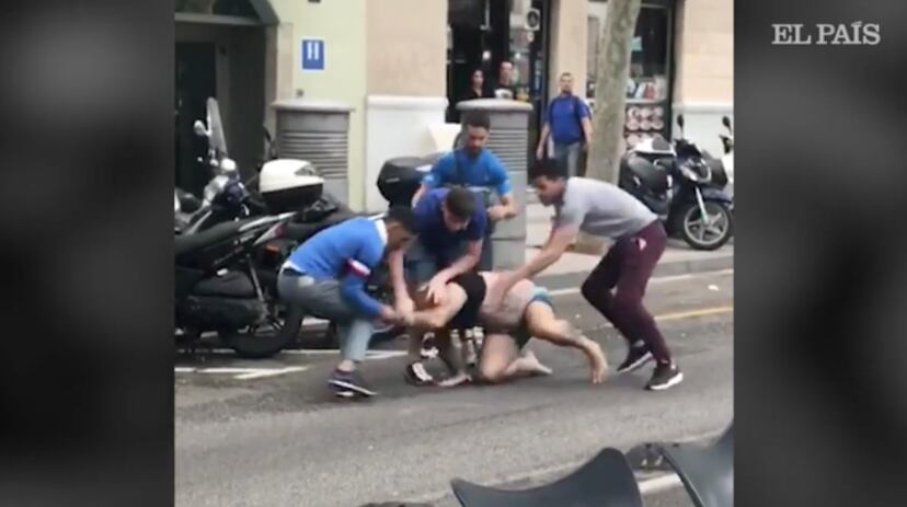 Los Mossos d’Esquadra han detenido este domingo por la tarde a cinco jóvenes acusados de robar con violencia a un hombre en la Rambla del Raval de Barcelona. Los ladrones están acusados de sustraer un reloj a la víctima, que la policía ha recuperado roto. Las imágenes del robo, grabadas por un testigo, muestran el elevado grado de violencia que han usado los ladrones.