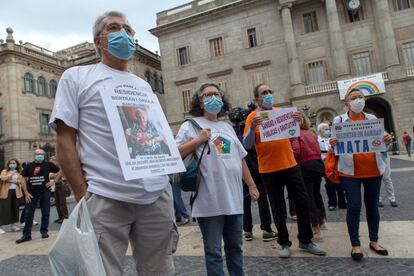 Una manifestación en la plaza Sant Jaume de Barcelona reúne a afectados por las deficiencias en los centros de mayores durante la pandemia