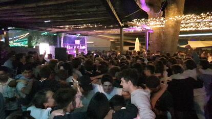 En un vídeo al que tuvo acceso EL PAÍS se observa cómo decenas de jóvenes cantan abrazados y sin mascarilla en la pista de baile principal del espacio gastromusical Badiu momentos antes del cierre, que se produjo alrededor de la 1.00. Diversos testigos señalan que, pese a la insistencia de los camareros, gran parte de los clientes que se congregaron durante toda la noche en las barras de este popular establecimiento solicitaron sus consumiciones sin mascarilla y a escasa distancia de los trabajadores.