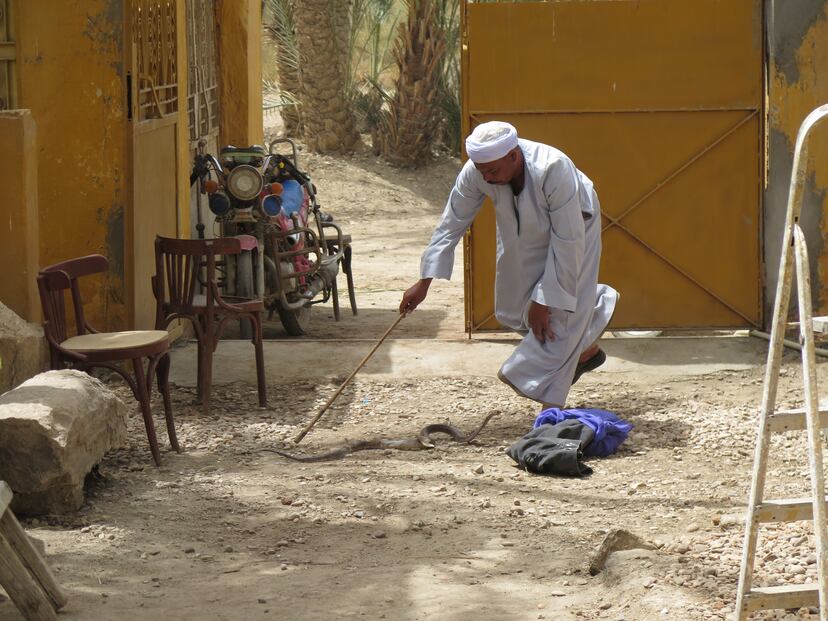 La cobra egipcia (Naja haje, un elápido, lo peor) es tremendamente venenosa y para nada compatible con los estudios egiptológicos. Se imponía, pues, tomar medidas drásticas. “Llamamos a un h’awi, un especialista en sacarlas de las casas, una profesión que pasa de padres a hijos. Venía de Beni Suef”. Esos personajes snake-catchers están a medio camino entre el mago, Moisés y el lampista y son lógicamente vista su profesión, universalmente admirados. Poseen un saber ancestral y quizá una inmunidad adquirida por su estrecho contacto con los ofidios. Hay dinastías famosas de h’awis como la del clan Tulba de Abu Rawash, al norte de Guiza, o los Refaey, de la misma afortunada localidad. Si se busca algo más profesionalizado hay una empresa en Cincinatti, Snake Removal. “Fue fascinante verlo trabajar. Entraba en una habitación, recitaba una salmodia y entonces establecía si había una serpiente o no. Las localizaba y las atrapaba, metiéndolas en una bolsa de plástico como de Lidl. Hizo salir la cobra al patio, la cogía por la cola, la serpiente se revolvía, erguida, con la caperuza abierta, intentando morderle. Él trataba de convencerla para entrar en la bolsa”. ¿Qué le decía?, pregunté a la egiptóloga dispuesto a no perder detalle del método. “Por lo visto pedía a Dios que le protegiera y convocaba a unos santos. A la vez iba declarando que era muy creyente, y que eso le protegía”. Lo anoté todo. “No mataba a las serpientes, nunca lo hacen esos especialistas. Se las llevan vivas. No sé qué hacen luego con ellas”. Vaya usted a saber. Confiemos que no dejen las bolsas por ahí.