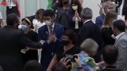 “Las cárceles donde habéis estado serán parte de la historia de Cataluña. No olvidaremos lo que habéis vivido vosotros y vuestras familias, vuestro sacrificio no será en vano”, ha añadido el vicepresidente, que ha insistido en que el referéndum del 1-O, que el Tribunal Constitucional declaró ilegal, “no fue ni un error ni un delito”. Tras los discursos, tanto consejeros como expresos han departido un momento en el Pati dels Tarongers y después se han apresurado al Parlament para atender la recepción que ofrecía la presidenta de la Cámara, Laura Borràs.