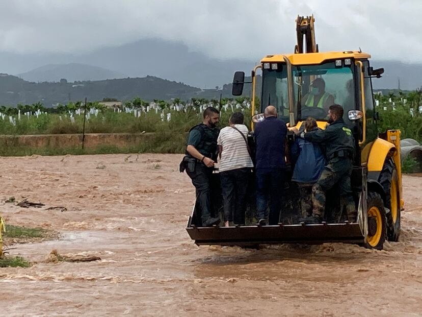 “Ha sido en dos minutos”, ha relatado Juan Ciudad, al que han tenido que sacar de su coche después de asegurarlo con cuerdas, dada la fuerza del agua que, desbordada de un barranco, ha anegado la carretera. En esos momentos apenas caía agua, por lo que no ha sido una conducción temerosa, sino que la tromba ha llegado por tierra, desbordada, rugiendo. “Hemos pasado miedo, sí. El agua iba subiendo por el coche y mi marido está recién operado”, cuenta Conchita Rollad, quien iba a iniciar este miércoles sus vacaciones. Ellos, como otras cuatro personas, han sido rescatadas y posteriormente trasladadas en la pala de una excavadora hasta un punto seco. Uno de ellos ha tenido que ser atendido por los servicios médicos. Al lugar, donde a primera hora de la tarde del miércoles seguía lloviendo copiosamente, se han desplazado siete dotaciones de bomberos.
