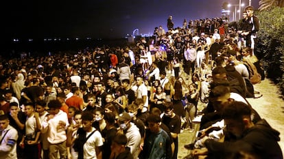 Algunos han venido caminando desde la blindada plaza de España, cruzando la ciudad. A medio camino estaban pensando si van a la playa Mario de 19 años, de Sant Adrià, y sus amigos Maria y Derek, de Cornellà. Llevan bolsas con vodka y zumo de mandarina y saben que si van a plaza España la policía se quedará con las botellas, aunque sean de plástico. Pasado el Puerto Olímpico, en el paseo marítimo y las playas de la Barceloneta también hay gente, pero mucha menos: unos pasean y otros están en pequeños grupos en la playa. El perfil es de gente más mayor y muchos vienen de las cuatro discotecas que tienen terraza y son de las únicas de la ciudad que pueden abrir hasta las tres de la madrugada, solo en el exterior.