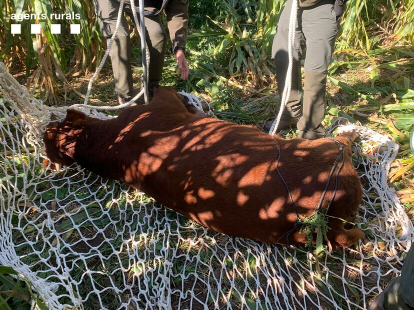 Brigadas de Agentes Rurales movilizadas. Seguimientos y vigilancias. Drones. Dardos anestesiantes e, incluso, el apoyo de un helicóptero. La operación para capturar a catorce becerros que se fugaron hace tres semanas de una granja de Algerri (Lleida) no repara en medios. El objetivo es interceptarlos cuanto antes mejor y evitar que sigan campando a sus anchas, porque los novillos, ejemplares de unos 400 kilos de peso, devoran todo lo que les sale al paso. Los agricultores de la zona han alertado del perjuicio que les reporta la libre movilidad de la manada bovina. Los campos de maíz se han convertido en el refugio franco de los animales huídos. Entre las altas matas de panizo hallan cobijo de sus perseguidores, a la vez que sacian su apetito. Más allá de los daños en los cultivos, los terneros suponen un riesgo para la circulación si merodean por alguna carretera.