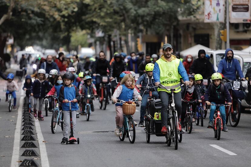 “El bicibús es cuando vas a la escuela en bici por la calle y en tu propia bici”. Liam tiene “cuatro años, casi cinco” y ni un publicitario resumiría mejor la iniciativa. La iniciativa del bicibús de Barcelona, familias que pedalean juntas para ir a la escuela, crece. Por ahora, solo los viernes, los biciviernes, bromean padres y madres que en muchos casos, son los mismos que el curso pasado impulsaron la revuelta escolar: cortes de calle un viernes al mes para reivindicar entornos más pacificados para luchar contra el ruido, la contaminación y los accidentes. Ahora pedalean porque les gusta y lo pasan bien, pero también para reivindicar una ciudad y una movilidad más sostenibles.