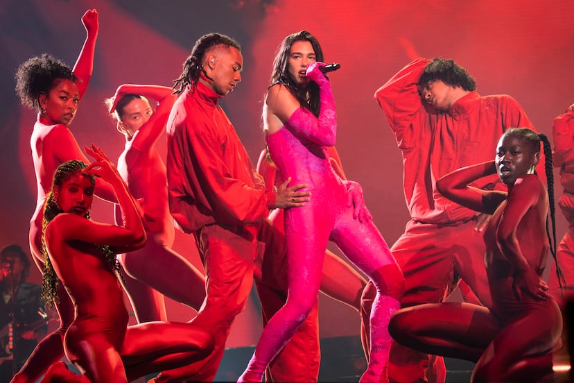 Agítese durante un par de años una botella de cava. Si no se astillan los codos de puro desgaste el resultado se parecerá a lo que este miércoles por la noche ocurrió en el Palau Sant Jordi de Barcelona cuando Dua Lipa comenzó un concierto dos veces pospuesto por la pandemia. Sí, espuma de alegría invadiéndolo todo, presión contendida desbordada, griterío saludando el encuentro largamente esperado y Phisical sonando a todo trapo para poner banda sonora al momento. ¡Qué instante! La joven que en la cola de acceso dijo “creía que no llegaría este momento” ya debía optar a la afonía. La londinense, de origen albanokosovar, con un traje pantalón fucsia y taconazos, aplicaba su poderosa voz a las primeras estrofas y el Sant Jordi lleno gritaba mientras la diva se contoneaba en escena rodeada por un acalambrado cuerpo mixto de diez danzantes. Sordera total fruto del griterío al acabar el tema, que dio paso al house-pop bailable de New Rules, uno de sus primeros éxitos, con la estrella ya en el pasillo que se adentraba en la platea para dejarse ver más cerca mientras unos paraguas en manos de las bailarinas redondeaban la estampa. Uno de ellos fue lanzado al público. Puro pop, alegría sin manual de instrucciones.