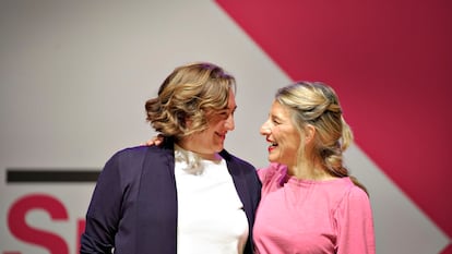 Yolanda Díaz exhibe el apoyo de Colau y se acerca al catalanismo con un discurso social