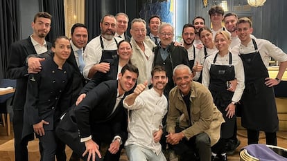 Rafa Zafra, chef del restaurante Amar de Barcelona donde anoche cenaron las parejas Obama, Springsteen y Spielberg, no cabe de gozo este viernes tras un servicio tan especial. “Fue increíble. Por mucho que lo sueñe no hubiera imaginado juntar a tres personas tan importantes y sus señoras”, dice emocionado. Aunque el personal de seguridad les había pedido previamente que no tomaran fotos del momento, fue Barack Obama quien, tras la cena, se dirigió a la cocina para felicitar al chef “por una de las comidas más impresionantes de su vida” y preguntó al personal si querían fotografiarse con ellos. El resultado fue la foto que ha corrido desde madrugada por las redes, publicada por el jefe de sala, Pol Perelló. Tras visitar la Sagrada Familia, esta noche, los Obama y los Spielberg acudirán al concierto de Springsteen, que inicia la gira europea en la capital catalana en el Estadi Olímpic a la nueve de la noche.