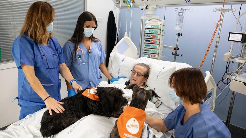 Vida sube a la falda de Francisco. El hombre, de 80 años, le acaricia el pelo y la perra se entrega a él, pegando su cabeza al torso. “Eres muy guapa”, parece decir el anciano. La escena, que podría darse en cualquier hogar, ocurre en la UCI del hospital del Mar de Barcelona. Francisco está postrado en una cama del centro médico desde hace poco más de una semana, y Vida forma parte de su terapia para reducir el estrés que ocasiona un ingreso en esta unidad. El contacto dura unos 15 minutos y forma parte del estudio que el centro y la Fundación Affinity, entidad que investiga el vínculo científico entre animales y humanos, han iniciado para cuantificar los beneficios del contacto animal en la unidad de críticos.
