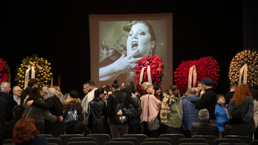 La sala Pal·ladius es un espacio polivalente del municipio. Está presidida por un escenario donde, en ocasiones, se pueden ver obras de teatro. A los pies de esa tarima de madera se ha colocado el ataúd abierto mostrando a la actriz amortajada con un vestido rojo chillón. En los laterales de la caja fúnebre, la llamada “bandera inclusiva” del colectivo LGTBI (una bandera que parte del arcoíris y a la que se ha añadido los emblemas de las diferentes reivindicaciones del colectivo). Había más banderas, a la izquierda del ataúd dos pequeños mástiles con la de España y la de Cataluña. Sobre el escenario, una foto en blanco y negro de la popular actriz y decenas de coronas y flores de diferentes instituciones, amigos y familiares.