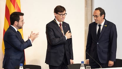 La designación como Illa de president consagra un cambio de ciclo en Cataluña que deja atrás al procés. Los socialistas regresan al Palau 14 años después de que fueran desalojados de la institución en las elecciones de 2010. El acto, celebrado en el Saló Sant Jordi, recién restaurado para recuperar su origen renacentista, ha consistido en la lectura por parte del presidente del Parlament, Josep Rull (Junts), de la resolución del nombramiento y de la imposición por parte del expresident Pere Aragonès de la medalla de la Generalitat que acredita a Illa como president.