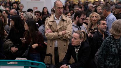 Sergio y Fernando, integrantes de la banda de heavy metal Manowar, tenían previsto viajar en AVE de Barcelona a Pamplona, donde tienen un concierto. No son los únicos, pues entre el colapso en el área de información se han podido ver muchos fans del grupo a los que todavía no les han facilitado ninguna alternativa. “Llevamos tres horas esperando a poder hablar con el personal, pero es imposible. Ahora nuestro tren no aparece ni en pantalla”, lamentan los cantantes.