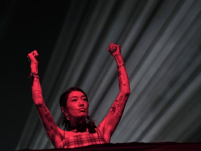Qué decir de la actuación de Peggy Gou. Convertida en misteriosa y atractivísima Dragon Lady, la surcoreana nos sumió con su aspecto de reina pirata de Malasia o madame oriental de un fumadero de opio en un sueño palpitante en el que los puñetazos de sonido y luz se punteaban con fumaradas que parecían brotar de los belfos de Tianlong, el dragón celestial. Hasta la famosa tonada (It goes like) Nanana sonó a artes marciales sonoras. No me ha sorprendido saber que la hermosa Peggy, que va tatuada como si se hubiera puesto encima el mahjong entero, es originaria de Inchon, en cuyos pantanos se libró una de las batallas más cruentas de la Guerra de Corea y donde los marines sufrieron de lo lindo. En contraste lo de Pa Salieu, artista del afrobeat con elegantes aires de Sidney Poitier, sonó a clásico, aunque su set, con máscaras africanas y torres de mecanotubo, tenía un no sé qué inquietante de Isla de la Calavera, como si fuera a salir en cualquier momento King Kong. En ese concierto una chica que bailaba a mi lado se sacó una pinza del pelo y me la puso a mí; “para que se te aguante el flequillo”, me susurró al oído con inopinada ternura en medio de la barahúnda sonora. Extraños momentos del Sónar.