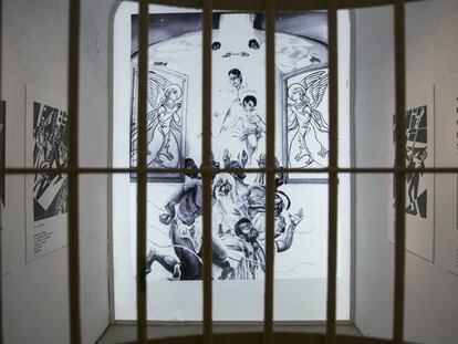 Gabriel Gómez tenía cinco años cuando visitó a su padre Helios Gómez, recluso en la cárcel Modelo de Barcelona. Era un sindicalista antifranquista, pintor, cartelista y poeta de etnia gitana al que la represión franquista encarceló varias veces. En 1948 fue recluido por pertenecer a una asociación declarada como ilegal. Estuvo encarcelado hasta 1954. “El día de la Mercé permitían que los familiares viniéramos a la prisión. Estuve en el patio de la Modelo con mi padre. En casa pasábamos mucha hambre y vi el rancho de garbanzos que les iban a dar pero no me dejo probar bocado”, recuerda Gómez. Es de los pocos recuerdos que conserva. Helios murió en 1956 con 51 años. En 1950, siendo recluso, el sacerdote de prisión, Bienvenido Lahoz, obligó a Helios a pintar en una celda —la número 1 del primer piso de la cuarta galería— una capilla para que los reclusos pudieran rezar antes de que les enviaran al pelotón de fusilamiento. “Sé que al principio se negó. Luego pintó una virgen gitana, los ángeles también y los personajes que aparecían en la obra eran otros reclusos”, instruye Gabriel. La obra de arte pasó a denominarse la Capilla Gitana y solo podían disfrutar los presos de la cuarta galería. En 1998, bajo el mandato convergente en la consejera de Justicia de Núria de Gispert, el director de la Modelo alegó “razones de higiene” y ordenó pintar de blanco la celda. Han pasado 27 años en los que Gabriel ha reivindicado constantemente la obra y ha denunciado la aberración artística perpetrada contra la Capilla Gitana.