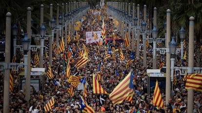 Hace solo 10 años, 1,4 millones de personas, según la Guardia Urbana, llenaron las calles de Barcelona durante la Diada. La llamada Vía Catalana, que ocupó 5,5 kilómetros, fue uno de los momentos efervescentes del procés, en pleno camino rumbo al choque del referéndum unilateral de 2017. El panorama, de este jueves, fue completamente distinto: 28.000 personas participaron en una manifestación mermadísima no solo por un día inicialmente lluvioso, sino también víctima de la desorientación que vive el independentismo. La convocatoria de Girona reunió a 12.000 personas y la de Tortosa a 1.500. Incapaz de reactivar a sus bases tras la pérdida de la Generalitat, el secesionismo además se enfrenta a gestionar el crecimiento de la pulsión ultra en su seno. La presencia de la líder de Aliança Catalana, Sílvia Orriols, en el acto convocado por las entidades independentistas ha generado tensiones en el recorrido.