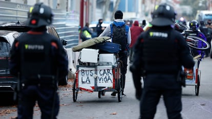 Los habitantes del B9, la mayoría migrantes subsaharianos, han empezado ya a recoger sus pertenencias bajo la vigilancia de un amplísimo despliegue policial que incluye efectivos de la policía local, los Mossos d’Esquadra y el Cuerpo Nacional de Policía, este último con competencias en materia de extranjería. Ni la protesta convocada a primerísima hora por las organizaciones que dan apoyo a los residentes del instituto ni los recursos judiciales de último minuto han hecho virar un desenlace que quedó fijado el pasado 4 de diciembre. Ese día, la jueza accedió a la petición del Ayuntamiento de Badalona de entrar al local y echar a los ocupantes en un plazo máximo de 15 días y en horario “diurno”. Es la solución que el alcalde, Xavier García Albiol (PP) llevaba meses reclamando con el argumento de que los migrantes del B9 son en su mayoría delincuentes y causan problemas de inseguridad e incivismo.