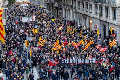 La jornada comenzó con la cita convocada por la Assemblea Nacional Catalana (ANC) y el Consell de la República. A mediodía, unas 8.000 personas recorrieron los 1,3 kilómetros que separan el monumento a Rafael Casanova de la plaza de Sant Jaume. Una gran ola donde se veían más estelades que carteles con mensajes sobre el caos ferroviario certificó que se mantiene la capacidad de esas entidades para movilizar a sus bases. “Fuera Renfe, fuera España” fue uno de los gritos más repetidos por una multitud que también dedicó puntos del recorrido para recordar el referéndum del 1-O. Un grupo de jóvenes encapuchados quemó una bandera española al paso por la plaza de Urquinaona.