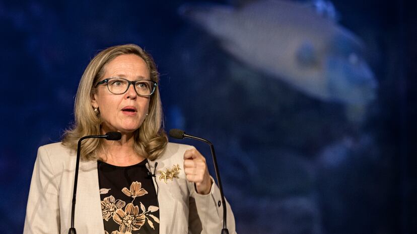 Antes de someterse a las preguntas y ante un público formado principalmente por cargos públicos y empresarios, Calviño ha esbozado un panorama alentador, en el plano económico, de España. Ha destacado que la salud y la economía van de la mano y que la tendencia positiva en la creación de empleo de agosto continúa en septiembre. Ha ponderado “el enorme éxito del bono verde soberano” en el país, que “ha tenido una demanda de 60.000 millones de euros”, cuando estaba previsto que emitiese solo 5.000 millones. “Todo apunta a que España, como prevén los organismos internacionales, es uno de los motores de la recuperación económica y prevé crecer un 6,5% este año y un 7% el próximo”, ha abundado sobre la situación de uno de los países de la Unión Europea en los que más cayó el PIB durante la pandemia del coronavirus. Mientras hablaba, numerosos animales marinos se desplazaban de un lado a otro del enorme acuario a la vista del público que cierra el escenario del espectacular auditorio del Mar Rojo, en el complejo de la Ciudad de las Artes y las Ciencias de Valencia.